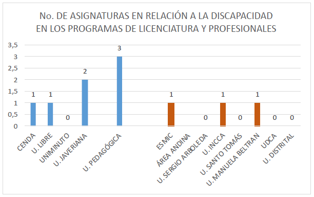 Figura 1: Número de asignaturas en relación con la formación en discapacidad en los planes de estudio de los programas de licenciaturas y profesionales