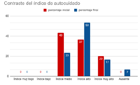 En cuanto al valor de autocuidado, los estudiantes lo entendían como aquellas acciones que pueden brindar bienestar y salud a sí mismos. Hacían mucho énfasis en la higiene personal y en la actividad física. Aunque reconocen estos hábitos, muchos de ellos mencionan que no los realizan por razones laborales, falta de tiempo o decisión personal. Sin embargo, durante y después de la propuesta pedagógica, los estudiantes reconocen factores como el horario de sueño, el descanso, la alimentación saludable y la práctica deportiva como elementos importantes para el autocuidado. Además, comprenden que estas acciones pueden formar parte de su rutina diaria sin afectar sus ocupaciones. Todo esto se ve respaldado por los cambios en los resultados obtenidos del cuestionario de valores antes y después de la participación en la propuesta pedagógica, como se ilustra en la figura 1. Se observa un cambio en la escala de valores del cuestionario, reflejado en la tabla 1, en la que se aprecia una influencia positiva en las acciones de los estudiantes. Se puede ver que el índice medio disminuye en el cuestionario final y el índice alto aumenta aproximadamente un 16 %.