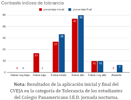 Frente al valor de la tolerancia, existe inicialmente una diferencia de umbrales de aceptación de diferentes acciones que generan conflictos en la comunidad. En muchas ocasiones, estos se solucionan a partir de agresiones físicas y verbales entre las partes implicadas. Además, se reconoce el uso de un vocabulario ofensivo en su comunicación. Sin embargo, en la actualidad, los estudiantes aceptan y reconocen las diferencias que existen entre ellos, determinando el diálogo como el factor principal para la resolución de conflictos y la interacción con la comunidad. Esto se debe a las actividades grupales desarrolladas en la propuesta pedagógica. Además, el cambio se ve claramente reflejado en la figura 3, con los resultados comparativos de la aplicación del cuestionario. De este modo, el índice bajo desaparece en el segundo cuestionario, mientras que el medio y alto aumentan y el muy alto se mantiene.