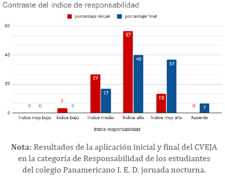 Con relación a la responsabilidad, existen diferentes situaciones que afectan este valor, como la impuntualidad, la falta de motivación para realizar las obligaciones académicas o las malas actitudes frente a la participación en las actividades de la institución. Sin embargo, al ser parte de la propuesta pedagógica, los estudiantes comienzan a reconocer el aprendizaje de la responsabilidad, entendida desde las consecuencias de sus acciones en sí mismos y en los demás. Esto se logra a través del trabajo en equipo y la cooperación entre compañeros para alcanzar un objetivo común, así como comprometerse y cumplir con las funciones de los roles asignados en las actividades. Esto se puede observar en la figura 4, donde se evidencia que los índices bajo, medio e incluso alto disminuyen, mientras que hay un aumento considerable en el índice muy alto, que alcanza un 24 %.