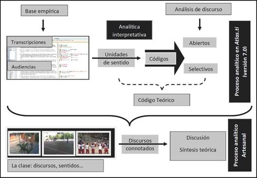 • Codificación del material o información recolectada. Se realizó a través de la herramienta de análisis Atlas.ti (versión 7.0), proceso del que se salió con la emergencia de un código teórico luego de los procesos de agrupación de códigos en familias de códigos, en lo que representó un tránsito entre la codificación abierta y la codificación selectiva o axial sobre las diferentes fuentes de información (observaciones en campo, entrevistas, audiencias, análisis de videos de clase).