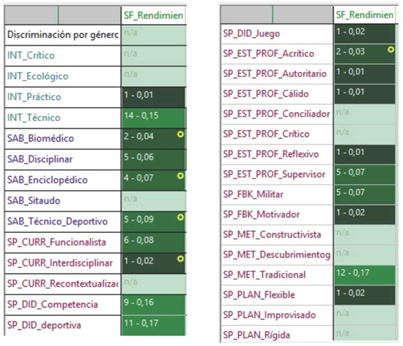 La Figura 2 muestra, a partir del tono o intensidad del color verde, cómo el rendimiento presenta una co-ocurrencia con los demás códigos presentes en la base empírica del estudio.