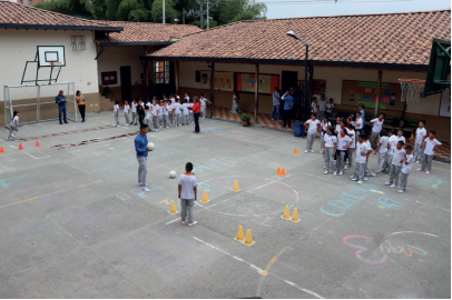 La imagen denota a un profesor que, sentado en las gradas, dirige la actividad. También se observa al grupo de estudiantes dividido y ubicado en filas en las cuatro esquinas de la placa polideportiva del colegio. Sobre el suelo hay conos y aros. Contextualización del enunciado. La foto corresponde a un momento en el que se utiliza un juego (piedra, papel o tijera) para dinamizar una actividad en la que los estudiantes deben realizar zigzag en velocidad por entre los conos y aros que hay sobre el piso del patio. El profesor en formación constantemente recurre a la competencia para motivar al grupo. El objetivo no es el juego de piedra, papel o tijera (juego popular), sino el ejercicio sobre las capacidades físicas. Análisis descriptivo-comprensivo. La imagen en sí ya es bastante diciente: un grupo de estudiantes de primaria, dividido a su vez en cuatro subgrupos ubicados cada uno en hilera sobre las cuatro esquinas de una plaquita polideportiva gris. La representación es patética y conmovedora, obedece al escaso tiempo y espacio que le dedica hoy la escolarización al movimiento en la escuela; un movimiento que no solo por la captura o el congelamiento (obvio) de la foto, se advierte como un ejercicio de domesticación del cuerpo y del movimiento mismo. La línea recta de conos de demarcación, así como la sugestiva presencia de los aros sobre el cemento, que seguro está caliente en la inclemencia del ambiente de medio día en Medellín, sugieren pensar que lo que allí se da es mucho más que un juego, que la práctica moldea unas disposiciones que se desvanecen y se confunden, probablemente, en los deseos mismos del profesor que cómodamente orienta desde la tribuna. Sus razones o argumentos están tan acartonados de explicaciones académicas que parecen alinearse paralelamente a la línea que trazan los conos en el suelo, con la seguridad, casi incuestionable, del saber fisiológico y motriz que traza la matriz deportiva sobre la EF en la escuela. Poco a poco va saltando, sobre la imperturbabilidad de la fotografía o del momento capturado, la instrumentalización del juego popular y la domesticación de la cultura lúdica infantil presa de la ficción sacralizada del desarrollo técnico y motriz. ¿Cuántos, con el rótulo de "licenciados en Educación Física" nos atrevemos hoy en día a invertir la ecuación? A pensar al margen de las invenciones que ubicaron la EF en el lugar del cultivo y el compromiso motor y físico. La imagen lentamente revela el código contenido, como si dijera que toda esa organización y la utilización misma del juego de piedra, papel o tijera es solo un pretexto para que niñas y niños salten y sorteen obstáculos, no de juego, de entrenamiento. Es muy importante, advierte la icónica y el mutismo serio que ofrece el momento congelado. Juega, pero eficientemente. ¡Rinde! Contextualización del enunciado. El grupo de estudiantes que se encuentra en el patio o placa polideportiva ya ha sido dividido previamente en el salón; los hombres van a una práctica y las mujeres van a realizar otra con un profesor diferente. En la imagen se retrata la práctica realizada por los varones; se desarrolla una clase de juegos cooperativos, esa es la indicación que ha dado inicialmente el profesor. No obstante, ha sido reiterativo con la vinculación del componente competitivo dentro de la clase; se realizan juegos cooperativos desde actividades competitivas. Análisis descriptivo-comprensivo. Ante la mirada desprevenida y también ante la mirada esperada de la matriz escolar y deportiva, la imagen representa, entre otras, el orden, el control y la certeza de una práctica estructurada. Los conos de demarcación son, nuevamente, protagonistas y faros dispuestos en el suelo para el adiestramiento del movimiento y de la expresión de los cuerpos. Todo parece estar calculado; quizá hemos pasado de la gimnasia a los juegos deportivos, pero la limpieza de la tradición higiénica de la EF queda descubierta en la fotografía. En la esquina descansan un grupo de aros coloridos, su destino es predecible en medio del contexto de la foto, la psicagogia y la psicomotricidad avalan bien su instrumentalizado y cosificado uso. La ciencia también respalda, con el pretexto del desarrollo -una de sus metáforas favoritas- la conformación de un cuerpo dócil y productivo que en medio de la discursividad y los imaginarios circulantes no dejan espacio a la sospecha o interrogación: se trata del rendimiento por la vía del moldeamiento de cuerpos y subjetividades simétricamente deseadas. La cooperación, fin aparente y explicitado en la sesión de clase, se va desvaneciendo o perdiendo en la lógica oculta de un saber hacer caracterizado por la exaltación de las capacidades y condiciones físicas y privilegiado desde los inicios de la EF escolar. ¡Coopera y rinde! La imagen muestra una placa polideprotiva en la que hay dos grandes grupos de estudiantes diferenciados, cada uno con un profesor y profesora diferente. El grupo del fondo hace clase con una profesora; se encuentran organizados en dos hileras, sobre el suelo dos escalerillas dispuestas para el desarrollo de la coordinación. El otro, el que sobresale en la foto, realiza clase con un profesor que sostiene una pelota en su mano derecha, el grupo de estudiantes observa con atención. Sobre el suelo de cemento gris se encuentran ubicados una serie de conos de demarcación deportiva. Contextualización del enunciado. La clase corresponde a una práctica en la cual se abordan fundamentos técnicos del fútbol; es una sesión en la que se enseña a cabecear el balón de forma perfilada. El profesor en formación argumenta que la clase tiene como objetivo trabajar la fuerza, la resistencia y la perfilación para cabecear y que, a su vez, se encuentra articulada a una unidad didáctica denominada “Juegos Predeportivos”. Cada semana se aborda un deporte diferente (fútbol, baloncesto y voleibol). Análisis descriptivo-