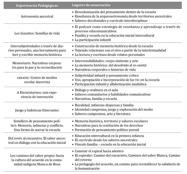 Ubicados en el horizonte biográfico, la narrativa hizo emerger el valor de la intersubjetividad que se funda en el relato entre “maestros que ya son y aquellos en formación”, a la luz de los contextos educativos. El sentido dialógico que se animó en cada encuentro movilizó la identidad narrativa (Ricoeur, 1999), al promover la enunciación colectiva de las experiencias docentes y la reflexividad que en ellas les llevó a reconocer cómo se trabajan articuladamente los lenguajes de la ciencia, el pensamiento matemático, la oralitura y las demás disciplinas, con los niños, las niñas y sus familias, en favor de la reconstrucción del tejido social al situar los contextos de ciudad y de país que habitan los sujetos que hacen tangible la construcción de humanidad, y por tanto, el valor de la escuela. La siguiente tabla 2 expone algunos de los lugares de enunciación hallados en cada una de las experiencias sistematizadas: