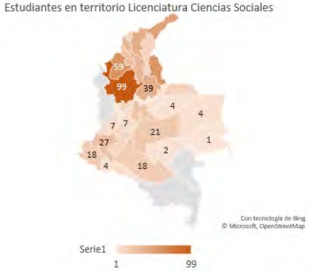 Como observaremos en la figura 1, los estudiantes que forman parte de la Licenciatura en Ciencias Sociales están distribuidos en 27 de los 32 departamentos, lo que permite una perspectiva nacional del impacto que tendrán los futuros maestros en los territorios. La relevancia de este estudio no se limita únicamente a la evaluación de problemas de investigación relacionados con las ciencias sociales, sino también en la comprensión de las representaciones que pueden obtenerse a partir de un enfoque holístico a nivel nacional. Esto proporcionará un acercamiento detallado a las realidades que experimentan los estudiantes, considerando contextos diversos como el conflicto armado, las migraciones, el desplazamiento, entre otros. Estos elementos se reflejarán en el análisis de los resultados, y ofrecerán una visión integral de los diferentes desafíos y situaciones que enfrentan los futuros maestros en su formación.