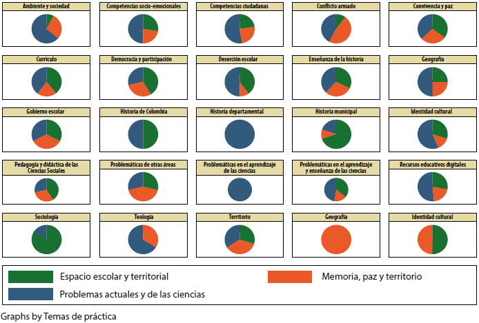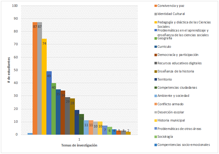 En la figura 4, sin embargo, se observa una incongruencia dentro de los temas y las líneas, ya que la convivencia y la paz, asociada a la Cátedra de Paz, en donde se entiende el concepto de paz como "como el sentido y vivencia de los valores ciudadanos, los Derechos Humanos, el Derecho Internacional Humanitario, la participación democrática, la prevención de la violencia y la resolución pacífica de los conflictos" (Decreto 1038 de 2015), se posiciona como el principal tema de investigación dentro de la sublínea de memoria, paz y territorio. A pesar de esto, tanto esta sublínea como la de espacio escolar y territorio, presentan una distribución equitativa en términos de interés. Este análisis revela la tendencia de los estudiantes hacia la identificación y solución de problemas actuales en el territorio, destacando la importancia de abordar estos desafíos desde la perspectiva de las ciencias sociales. Estos resultados ofrecen información valiosa para orientar futuras investigaciones y acciones que promuevan la innovación en la enseñanza de las ciencias sociales, considerando las necesidades adyacentes del sistema educativo en los territorios.