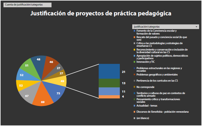 A prática pedagógica está associada à aprendizagem, refletindo processos contínuos nos quais os professores são influenciados pela experiência docente. Em segundo lugar, está associada ao ensino, enfatizando o papel tradicional do professor como portador do saber. Em terceiro lugar, surgem a experiência e o conhecimento, confirmando as posições dos respondentes, a maioria dos quais são professores Normalistas que trabalham em escolas colombianas. No entanto, nota-se um processo mecânico em que o ensino e a aprendizagem de conteúdos são o objetivo fundamental da prática pedagógica. Os professores em formação tendem a focar em temas investigativos relacionados à convivência, paz e identidade cultural. Vinte e cinco respondentes pertencem a algum grupo étnico, e a população está distribuída em quase todos os departamentos do país.