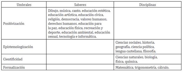 A continuación, se presenta para la discusión y el debate la tabla 1, que permite ejemplificar una organización provisional sobre la forma de distribución, que diferencia algunas de las disciplinas y los saberes escolares en los distintos umbrales de constitución de saber, tomando como referencia las áreas obligatorias estipuladas en la Ley General de Educación de 1994, y algunas de las disciplinas o saberes que han sido objeto de investigación histórica recientemente.