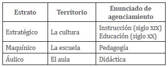 Las prácticas de enseñanza están emplazadas en tres sistemas de estratificación: uno de carácter general, correspondiente al ámbito que en el siglo XX se concretó en los sistemas educativos nacionales, otro que se asienta en el dispositivo escolar, y, finalmente, el que se ancla en las experiencias de las aulas de clase. Un primer nivel de orden estratégico es el que se despliega en la esfera de la cultura y de las formas como se organiza la sociedad; este en el siglo xix se articuló a partir del concepto de instrucción, pero en el XX se delimitó teniendo como eje estructurador el concepto de educación. Un segundo nivel está localizado en las prácticas institucionalizadas que se desarrollan en el escenario pedagógico-escolar, considerado un dispositivo maquínico. Y un tercer y último nivel es el áulico, centrado en las prácticas propias del aula escolar y sus agenciamientos, ya sea del método de enseñanza en un inicio o a partir del decenio de 1960, orientados por los discursos de lo didáctico escolar.