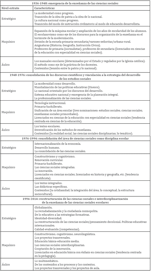 Para el análisis particular de las ciencias sociales escolares, a partir de las prácticas y los enunciados sobre la enseñanza de las ciencias sociales promovidos en Colombia a partir de los años treinta y la posterior consolidación del área de ciencias sociales en los años ochenta, se formula una periodización que delimita distintos niveles de concreción de dichas prácticas y evidencia el proceso de configuración de la enseñanza de las ciencias sociales escolares como campo de saber-poder específico. En la periodización propuesta se determinan cuatro temporalidades de mediana duración marcadas por rupturas que visibilizan las transformaciones experimentadas en la consolidación y la configuración de la enseñanza de las ciencias sociales en Colombia.