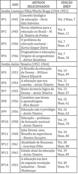 A opção por esta seção, como destacado anteriormente, se deu pelas publicações de expoentes do movimento de renovação educacional. Assim, mesmo considerando as demais seções da Revista profícuas para a análise, foi realizada uma escolha buscando sintonia com o problema de pesquisa proposto. Após estas definições, o foco passou aos artigos da seção escolhida, buscando definir quais aqueles que seriam mais pertinentes de serem analisados.
