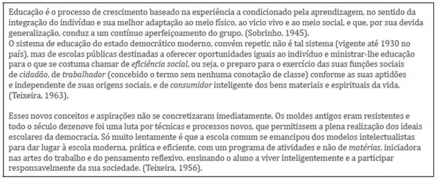 Apesar destes apontamentos, ao explorar as inspirações teóricas desta segunda face do escolanovismo no Brasil (Cunha, 2000), fortemente ancoradas em John Dewey, percebe-se que ele "não desenvolve explicitamente um conceito de aprendizagem, mas seu conceito de experiência educativa se confunde com o de aprendizagem e este, por sua vez, com os conceitos de crescimento, desenvolvimento e adaptação" (Noguera-Ramirez, 2011, p. 248). Assim, nesta grade interpretativa, a aprendizagem é uma ferramenta para alcançar outros objetivos. Portanto, a aprendizagem como experiência pode ser entendida como um tipo de aperfeiçoamento constante das conduções individuais, implicando uma postura educativa frente à vida, como exemplificam os excertos seguintes.
