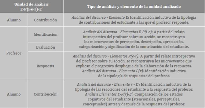 Fase de microanálisis. La unidad de análisis conformada por la interacción E-P-E' incluyó la contribución del estudiante a la que el profesor responde de forma inmediata y cómo esta respuesta es recibida por el estudiante. El enfoque microanalítico exigió altos grados de minuciosidad, se distinguieron en la intervención del profesor (P) tres momentos (identificación-evaluación-respuesta) que dieron como resultado la unidad ampliada E- P (i-e-r)-E', tal como se presenta en la tabla 1: