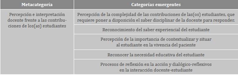 El proceso de percepción, interpretación, evaluación y discriminación que realiza el docente delante de las contribuciones de los estudiantes es un proceso dialéctico, dinámico y complejo, tal como se muestra en las categorías emergentes del estudio (Véase tabla 2):