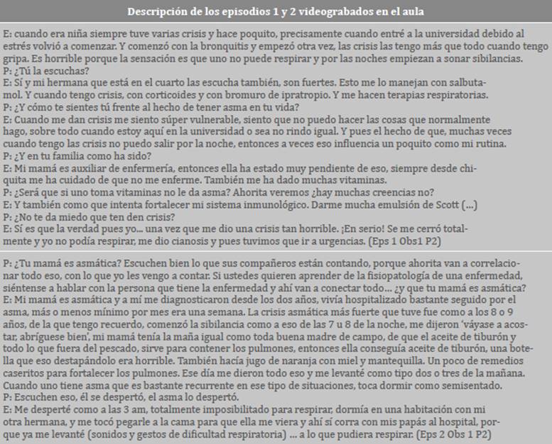 En una profesora se apreció cómo fomentaba el aprendizaje significativo en los estudiantes, al interrelacionar la entidad patológica -el asma, la experiencia del estudiante que vive con esta enfermedad y las características de los cuidadores del paciente con asma- mediante la estrategia pedagógica de partir de la experiencia del estudiante. Esta estrategia le permitió interrelacionar las dimensiones fisiopatológica, psico-emocional y social del asma. De esta manera contribuyó a la comprensión y aprendizaje del tema. A continuación, se presentan dos episodios: