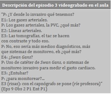 Otro aspecto que señalan las docentes como relevante en la contribución de los estudiantes, es su capacidad reflexiva y de análisis al lograr interrelacionar los conceptos teóricos con un ejemplo o anécdota del cuidado enfermero. En el siguiente episodio se observa cómo la intencionalidad comunicativa del estudiante es informar que el juicio clínico es la capacidad de anticipación que el profesional debe tener para evitar complicaciones en la evolución clínica del paciente: