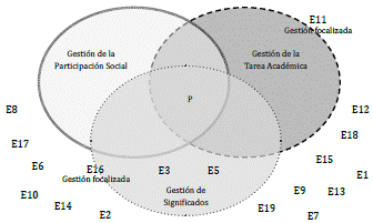 Mediante los análisis realizados se identifican diversas modalidades y grados de presencia docente desplegados por los participantes del caso estudiado (véase la figura 2). Se encuentra una modalidad denominada Gestión de la presencia docente, a la que se le atribuye un grado total puesto que se da como resultado de un perfil estructural idóneo y de un análisis de contenido idóneo representado en la intersección de las tres gestiones estudiadas (tarea académica, participación social y significados). Bajo esta modalidad y grado se identifica a P, como portador efectivo de presencia docente.