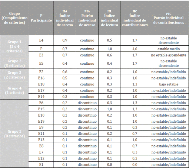 Los perfiles se ordenan y agrupan en función de su proximidad al perfil teóricamente idóneo para el ejercicio de la presencia docente, teniendo en cuenta los factores asociados a las dimensiones de acceso y participación. La frecuencia de acceso se relaciona con la posibilidad de seguir el hilo de las contribuciones y, por tanto, ofrecer ayudas al resto de participantes. El patrón de acceso se relaciona con la complejidad que supondría ejercer una influencia educativa en un marco de presencia más bien discontinua. La lectura de las contribuciones de los otros permite compartir el contexto discursivo que se está construyendo y, con ello, ofrecer ayuda. Las contribuciones mínimas esperadas permiten participar ofreciendo ayuda a los otros. Y finalmente, el patrón de contribuciones se relaciona con la necesidad de generar cierta estabilidad a lo largo de las fases de la actividad (Bustos, 2011).