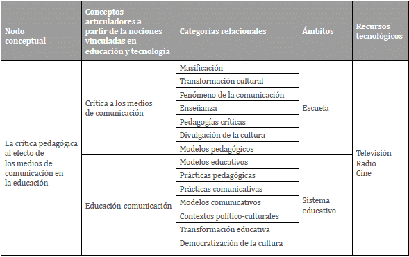 En general, este primer nodo conceptual presenta las nuevas tecnologías como invasoras de los escenarios que tradicionalmente ocuparon la escuela y el sistema educativo como transmisores de la cultura; se realizan cuestionamientos sobre cambios en la enseñanza y el papel de la escuela como centro del conocimiento. Para estos análisis críticos de los medios, los investigadores presentan categorías relacionales, como modelos pedagógicos y modelos comunicativos, prácticas pedagógicas y prácticas comunicativas, con un abordaje epistemológico desde la mirada pedagógica.