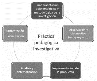 La segunda etapa tiene que ver con la elaboración del anteproyecto, desde la observación y el diagnóstico de problemáticas que los estudiantes evidencian en sus prácticas pedagógicas. Aquí se realiza una lectura de contexto o cartografía y se elabora un diagnóstico a partir de entrevistas, encuestas, pruebas o test de conocimientos, historias de vida, que les permite plantear una pregunta problema y una caracterización de la población. En la tercera etapa se plantea la propuesta pedagógica o derivación práctica y se implementa en los diversos lugares de la práctica. En estas propuestas los estudiantes plantean lo que van a implementar para tratar de mejorar la situación problema identificada y, en tal sentido, planifican las actividades pedagógicas que van a desarrollar, así como los instrumentos mediante los cuales van a evaluar los resultados de la intervención.