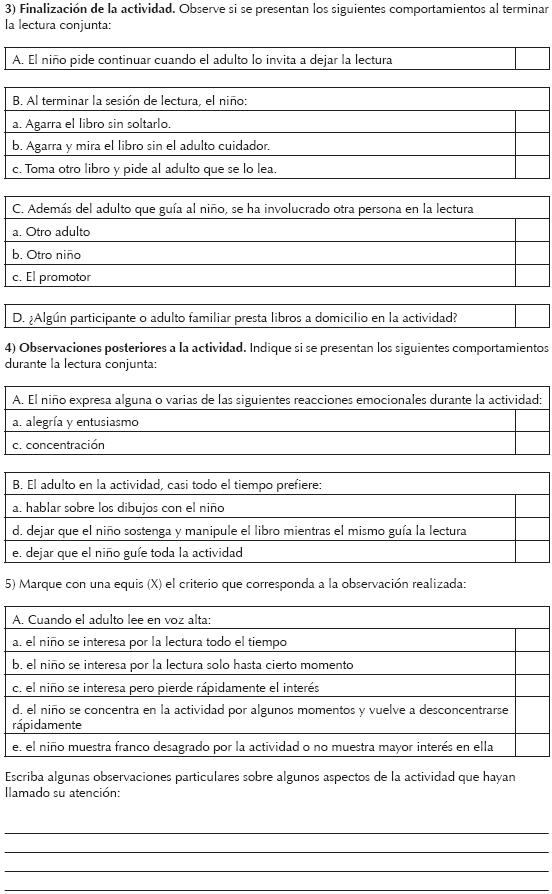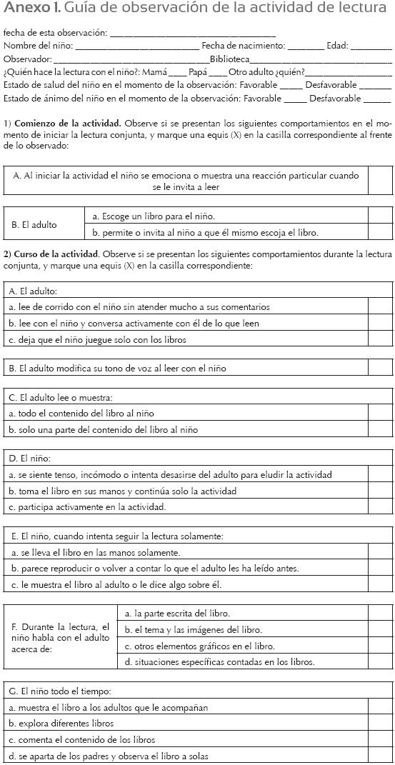 La Guía de observación de la actividad de lectura (basada en Flórez et al., 2006b) contiene 36 ítems (que corresponden a cada una de las variables indagadas en la lectura conjunta inicial) en los cuales un observador externo (ciego a los objetivos del estudio y a los detalles de la investigación) identifica si el aspecto mencionado en cada ítem se presenta. Cuando se presenta, el observador marca una equis en frente de dicho aspecto (anexo 1). Cuando no se presenta, deja sin marcar dicho aspecto. Posteriormente, en la base de datos, los aspectos observados de la lectura conjunta son calificados con 2 cuando se presentan, y con 1 cuando no se presentan. El observador registra una unidad de interacción en cada rejilla, donde cada unidad de interacción se considera una interacción adulto-niño leyendo u observando un libro particular. Cada interacción comienza cuando se toma un libro particular y finaliza cuando dicho libro se deja para terminar la actividad.
