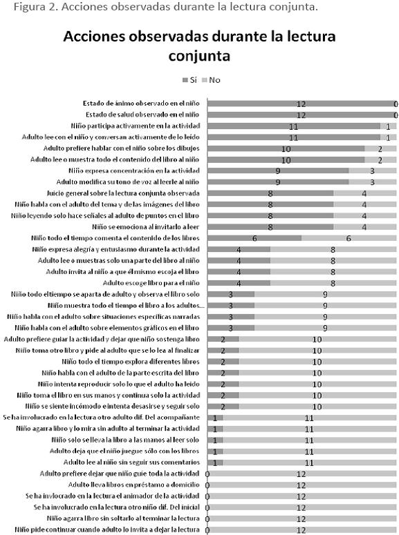 De otra parte, quince acciones que se presentaron solo en algunas díadas (con una frecuencia que va de su presencia de tres a nueve díadas). Entre estas, seis aparecen con más frecuencia (entre nueve y ocho díadas las presentan): el niño expresa concentración en la actividad, el adulto modifica su tono de voz al leer con el niño, el niño permanece atento todo el tiempo durante la realización de la actividad, el niño habla con el adulto del tema y de las imágenes del libro, el niño solamente hace señales al adulto en puntos específicos del libro durante la lectura y el niño se emociona al invitarlo a leer.