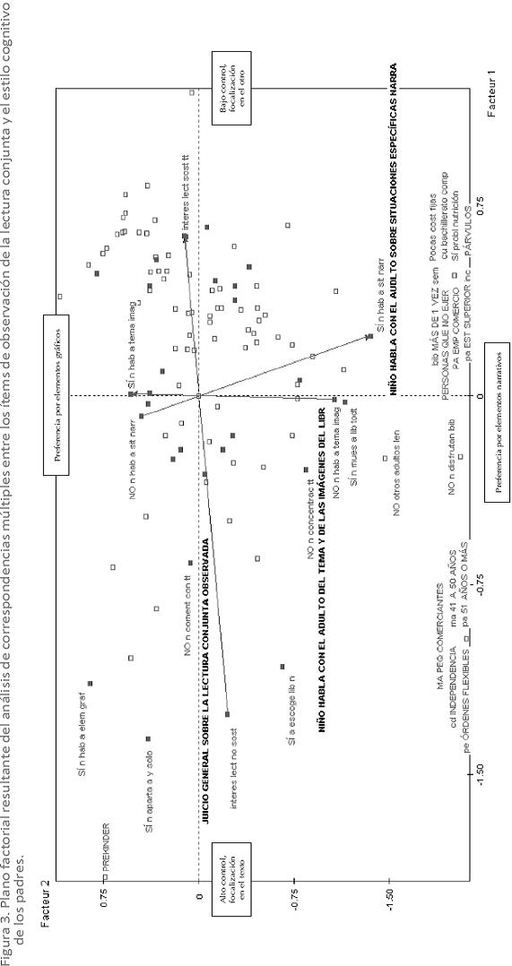 Los resultados también arrojan otra dimensión: la preferencia del niño por elementos significativos del texto, que también es reseñada por Bus (2002). Como lo indican las relaciones con otros factores, esta dimensión se relaciona con características demográficas del adulto con quien se realiza la actividad y con características de cercanía a actividades propias de familiaridad con el mundo de la lectura. Esto tiene dos posibles interpretaciones: o bien se trata de una diferencia de nivel (y no de estilo) que refleja factores de un medio alfabético enriquecido (Bus y Sulzby, 1996; Evans et al., 2000; Van Kleeck, 2003; Collins et al., 2005; Flórez et al., 2006a, 2006b; Flórez et al., 2007), o se trata de la adopción de un modo de conversación en los padres que es propio de algunos grupos culturales (Lee et al., 2004). Un conjunto de evidencias más grande nos podría iluminar si es válida la primera o segunda opción de interpretación.
