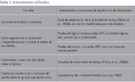 Las actividades de esta investigación se desarrollaron en seis sesiones de una hora y media por semana. En una primera sesión se realizó la caracterización del estilo cognitivo de los cuidadores, se aplicaron los dos cuestionarios sobre ideas y prácticas sobre lectura de adultos y niños en el hogar, sobre el ideal de formación del niño que tienen los adultos en el hogar, y se resolvieron dudas de los padres a acerca de su participación en esta experiencia. En las otras cinco sesiones se desarrollaron actividades de lectura conjunta de adultos y niños, con eventuales charlas de los padres con el investigador sobre la promoción de conocimiento con la lectura conjunta para fortalecer el vínculo interpersonal entre el niño y el adulto, y sobre el conocimiento de los libros disponibles para leer con los niños. En la segunda y la sexta sesión se llevaron a cabo observaciones de la lectura conjunta inicial en la Guía de observación de la lectura conjunta inicial. A las observadoras no se les permitió conocer objetivos del estudio, ni ninguna información concerniente a otras aspectos de esta y se les instruyó para que registraran en la rejilla de la guía de observación ''la tendencia que más predomine en la interacción entre el adulto y el niño luego de observarlos desde que toman un determinado libro hasta que lo dejan'' (ver ''Instrumentos'').