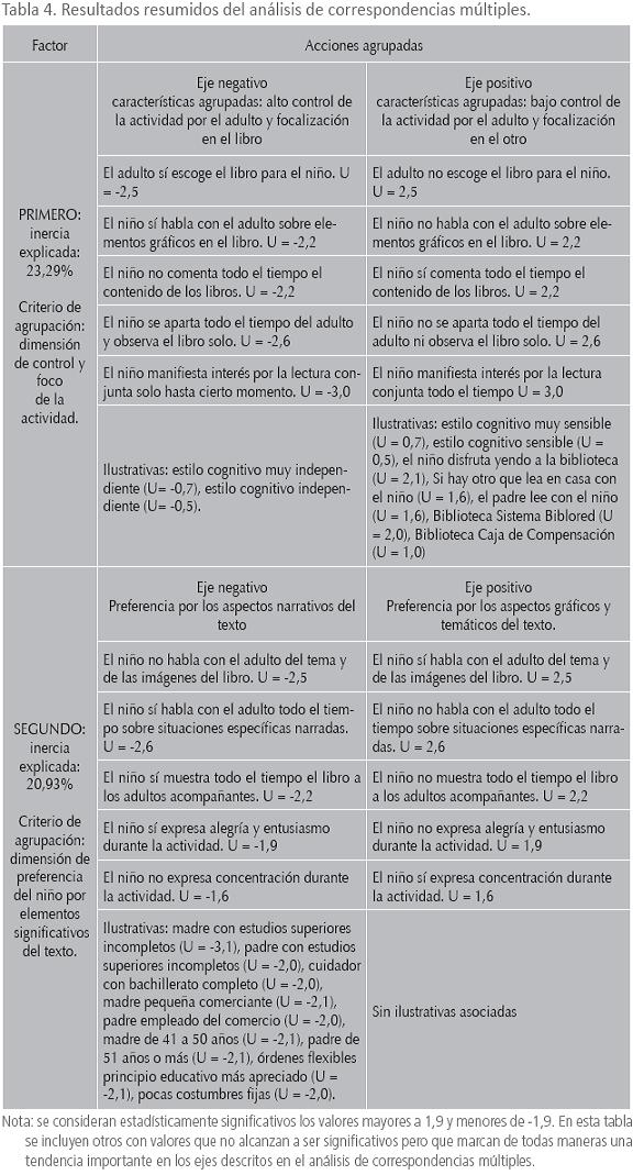 En el análisis de correspondencias múltiples se hallan dos tendencias o polaridades de agrupación de las acciones en la lectura conjunta: 1.más control yfocalización en el libro versus menos control con focalización en el otro y 2. preferencia por objetos gráficos y temáticos del texto versus preferencia por detalles narrativos del texto.