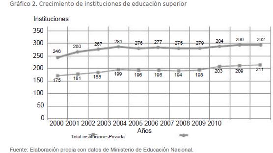 Esta nueva situación viabilizó el siguiente paso para que los principios de gubernamentalidad se aplicaran y, en medio de una simbiosis de autonomía y libertad, se dio paso al sector privado en la educación que se posicionó de los nichos de mercado más rentables con todo un mosaico de instituciones a granel. (gráfico 2).