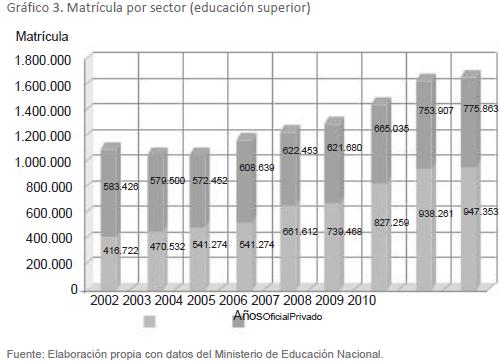 Es preciso hacer énfasis en que ante la impotencia de los Estados para corresponder con la demanda creciente de la educación terciaria, que el modelo definía como generadora de progreso y bienestar social, se acudió al principio de la meritocracia y de la apertura al sector particular, lo que justificó de alguna manera su falta de planeación y de implementación de una verdadera política de educación superior a largo plazo. Estos vacíos administrativos fueron ocupados por la oferta de cupos de instituciones particulares (gráfico 3).