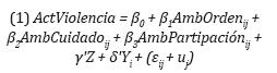 Para el estudiante i en la escuela j. En el modelo, el parámetro ß0representa el intercepto de la población, los parámetros ß1, ß2y ß3representan la pendiente de la relación entre los predictores principales -ambientes en orden, ambientes de cuidado y ambientes abiertos a la participación estudiantil, respectivamente- y la variable dependiente de interés -las actitudes de apoyo a la violencia-, después de controlar por las demás variables. El parámetro γ es un vector que representa los efectos de las variables control (sexo, nivel socioeconómico, capital cultural, educación de la madre, sector público/privado) sobre la variable de interés, y el parámetro δ es un vector que representa los efectos de las interacciones. Los residuos de la población del nivel 1 y el nivel 2 están representados por ε., y u. e incluidos dentro del modelo bajo los supuestos de distribución normal. Los parámetros de interés son ß1, ß2y ß3. En los análisis, se evaluaron las interacciones entre los tres predictores clave de ambientes escolares y se concluyó que solo la interacción entre ambientes de cuidado y ambientes en orden (AmbOrden*AmbCuidado) es significativa, mientras que las otras interacciones no agregan nada al modelo y por eso quedaron por fuera de los modelos finales.