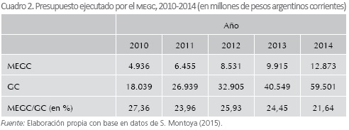 En los presupuestos del Ministerio de Educación del Gobierno de la Ciudad (MEGC) se observa que si bien el monto destinado al sector educativo entre 2010 y 2014 se ha incrementado en términos absolutos, ha ido disminuyendo en términos relativos con respecto al gasto total del GCBA. La participación del gasto del MEGC dentro del gasto total del GCBA cayó de 27,36 % en el año 2010 a 21,64 % en el año 2014.