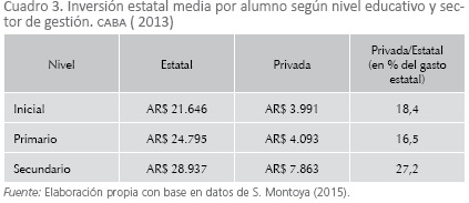 Los datos muestran que la inversión del Estado en ambos sectores de gestión crece según el ciclo del nivel educativo. Es así que la inversión estatal media por alumno en el sector de gestión estatal oscila entre $21.000 y $29.000 según el nivel educativo, y en el caso de privada varía entre $3.900 y $8.000.