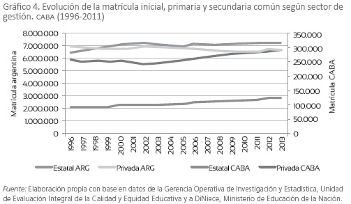 La matrícula del sector de gestión privada ha ido evolucionando en las últimas décadas al igual que el producto bruto interno (PBI) per cápita. La tendencia a partir del 2000 en ambos casos fue creciente, con excepción de los años posteriores a la crisis argentina (2001) y la crisis de las hipotecas subprime (2008).La participación de las transferencias del Estado al sector de gestión privada dentro del gasto educativo total da muestras de la importancia asignada a este sector de gestión. Entre 2001 y 2013, tanto el gasto educativo total como las transferencias a la educación privada presentaron una tendencia creciente. La participación de las transferencias a la educación privada dentro del gasto total se mantuvo relativamente, oscilando entre valores del 12 y 13 % como se puede observar en el gráfico 2.