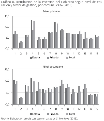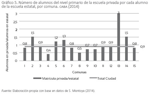 Enmarcada en la normativa vigente, la asignación de subsidios se constituye en una de las herramientas de política. Según los datos del 2012 para la CABA, las comunas con mayor porcentaje de escuelas primarias de gestión privada que reciben aportes estatales son las comunas 1, 4, 8 y 9. De estas, la 8 es la de menor proporción sin subsidio (0 %) y la 4 es la de mayor proporción con aportes del 100 %(72 %).