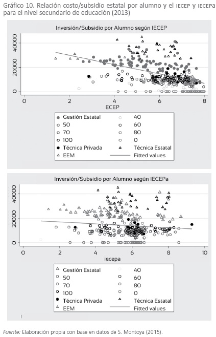 Manteniendo fijo el nivel de gasto por alumno, se puede observar la diferencia mencionada en los resultados del IECEP y IECEPa a través del valor que adoptan sobre el eje de las abscisas. Se puede percibir cómo mayores niveles de costo/subsidio estatal no necesariamente implican mejor calidad educativa.