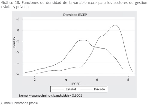 Las variables que se utilizan en este análisis son entonces el costo por alumno y el IECEP. Las distribuciones de ambas variables se muestran en los gráficos 12 y 13 según sector de gestión. La función de densidad de la variable costo por alumno muestra dos distribuciones de cola derecha, mientras que las funciones de IECEP muestran distribuciones de cola izquierda.