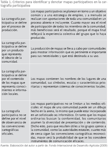Los mapas participativos proporcionan una valiosa representación visual de lo que una comunidad considera que es su lugar y de sus características distintivas. Abarcan descripciones de los rasgos físicos naturales, de los recursos y de los rasgos socioculturales conocidos por la comunidad [...] El proceso de Cartografía Participativa puede influir en la dinámica interna de una comunidad ya que puede contribuir a cohesionar la comunidad, a estimular a sus miembros a intervenir en la adopción de decisiones sobre la tierra, sensibilizar en torno a los problemas apremiantes relacionados con la tierra y, en último término, contribuir al empoderamiento de las comunidades locales y de sus miembros. (Fondo Internacional de Desarrollo Agrícola, 2009, p. 4)