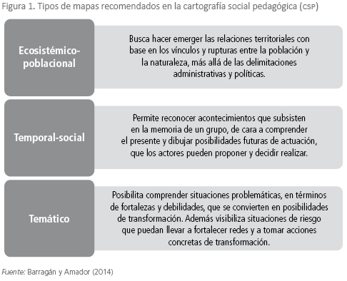 En la CSP el mapa se concibe como una representación gráfica que, realizada en colectivo, deja ver las tensiones socioculturales que surgen en determinado territorio físico donde suceden situaciones de enseñanza y aprendizaje (aula, escuela, barrio, ciudad, ciberespacio, etc.). Sin embargo, el mapa también puede expresar un territorio epistemológico o uno existencial, en estos casos aquello que aparece son las abstracciones constituidas en colectivo, en las que se resignifican las comprensiones de diversos temas educativos y pedagógicos, los cuales deben plasmarse cartográficamente a partir de las experiencias de los participantes y, si es el caso, de la teoría educativa. Como producto discursivo, el mapa evidencia la subjetivación de los participantes de la CSP. Se pueden enunciar tres tipos de mapas que logran ser punto de partida para explorar las posibilidades de esta opción metodológica (Barragán & Amador, 2014): el ecosistémico-poblacional, que se refiere a relaciones territoriales; el temporal-social, en el que se exploran las tensiones de pasado, presente y futuro; y el temático, que configura las problemáticas y la planificaciones concretas (véase la figura 1).