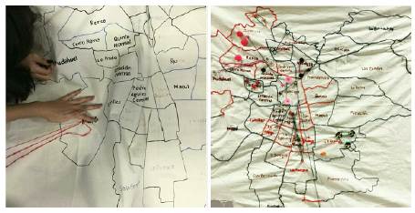 Fotografías 1 y 2. : Diseño del mapa de ¡a Región Metropolitana en el proyecto "La cartografía de los aprendizajes amorosos: reconocimiento de autoridad femenina en los procesos de aprendizaje" (2018)