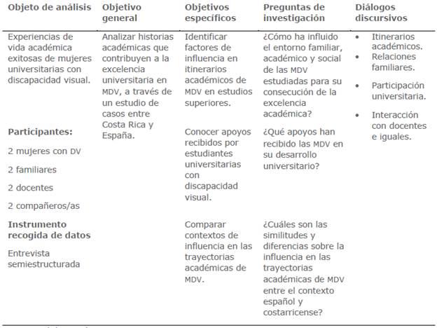 Neste artigo de pesquisa é feita uma abordagem à vida académica das mulheres com deficiência visual com o objetivo de analisar as suas histórias formativas e os fatores que contribuem para a excelência académica. É apresentado um estudo comparativo do caso de duas mulheres com deficiência visual inscritas em universidades da Costa Rica e Espanha, com base numa hermenêutica qualitativa e na adaptação da teoria fundamentada de desenho construtivista. Os dados foram recolhidos através de entrevistas semiestruturadas e analisados utilizando o método comparativo constante com o apoio do software Atlas-ti v. 8. Havia oito participantes, quatro unidades de observação para cada caso e país: a mulher com deficiência visual, um membro da família, um professor e um colega de sala de aula. O quadro de análise incluiu quatro dimensões: ambiente pessoal, familiar, académico e social. Os resultados mostram que os fatores exógenos ligados à excelência académica colocam a família, o grupo de pares e o pessoal docente como apoios permanentes para as mulheres com deficiência visual nas suas trajetórias académicas. No entanto, a família tem uma influência ambivalente, tanto como apoio como como barreira, e emerge uma falta de consciência, especialmente entre professores e estudantes. Os fatores endógenos que favorecem a excelência académica estão relacionados com o esforço, o desempenho e a atitude individual, cujo eixo principal é constituído pelas características resilientes desenvolvidas. A violência, presente no meio académico em várias manifestações, destaca-se como uma categoria emergente.