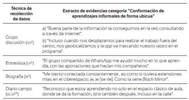 Tabla 2: Evidencias seleccionadas de la categoría "Conformación de aprendizajes informales de forma ubicua"