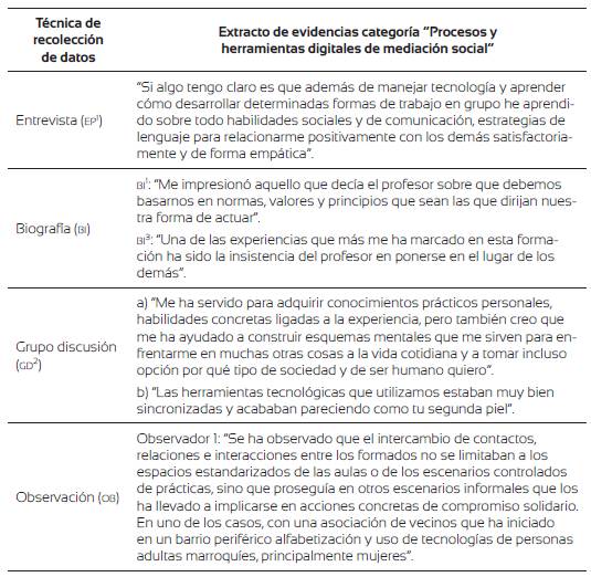 Tabla 3: Evidencias seleccionadas de la categoría "Procesos y herramientas digitales de mediación social"
