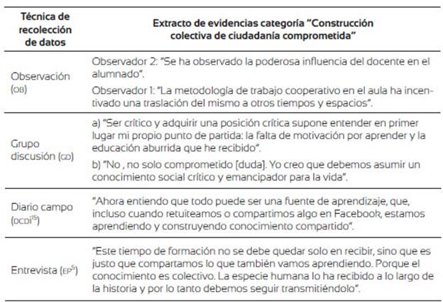 Tabla 4: Evidencias seleccionadas de la categoría "Construcción colectiva de ciudadanía comprometida"