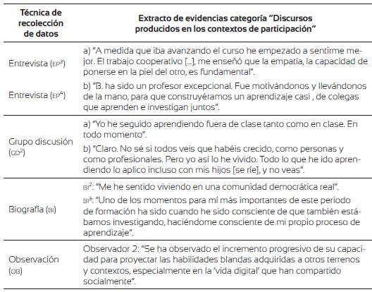 Tabla 5: Evidencias seleccionadas de la categoría "Discursos producidos en los contextos de participación"