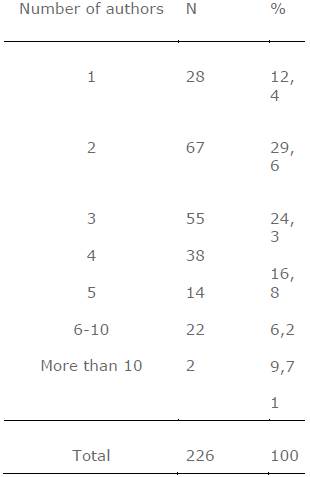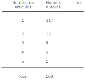 En cuanto a la productividad personal, un total de 160 autores firman los 226 artículos. Este dato se analiza en base a la ley de productividad científica de Lotka, que establece que solo un reducido número de autores publican una cantidad importante de textos centrados en una misma temática. Tal y como se observa en la tabla 1, en este caso predominan los productores ocasionales, ya que, un total de 117 autores (73 %) solo cuentan con una publicación y 37 autores (23 %) han elaborado 2 artículos. El resto (4 %) se pueden considerar productores medianos, y no se ha encontrado ningún gran productor.