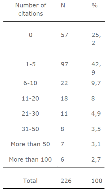 On the other hand, if we consider the impact of the articles in terms of the number of citations received, Table 3 shows that most of them have zero or little impact, with 68.1% receiving between zero and five citations.