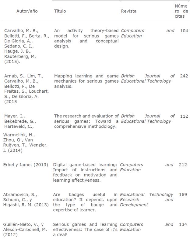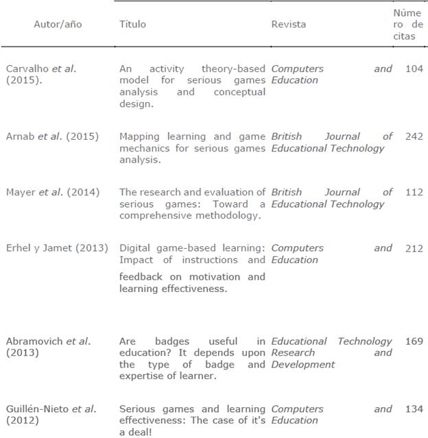 Las revistas en las que se han publicado mayor cantidad de artículos sobre la implementación de videojuegos en educación son: Computers and Education (9 %), British Journal of Educational Technology (6 %), International Journal of Emerging Technologies in Learning (5 %) e International Journal of Game Based Learning (5 %).