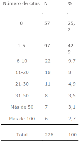 Por otra parte, si se considera la repercusión de los artículos en base al número de citas recibidas, en la tabla 3 se observa que la mayoría de ellos tienen un impacto nulo o escaso, ya que un 68,1 % ha recibido entre cero y cinco citas.
